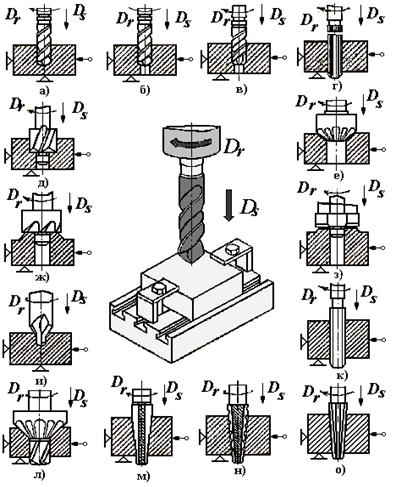 Фрезы классифицируют по назначению и конструкции. Для обработки горизонтальных плоскостей используют цилиндрические и торцовые фрезы. Торцовые фрезы обеспечивают большую производительность и лучшее качество обработки, чем цилиндрические. Цилиндрические фрезы применяют только на горизонтально-фрезерных станках. Наклонные плоскости обрабатывают угловыми фрезами, хотя возможно использование концевых и торцовых с установкой заготовки на поворотном столе. Для формирования пазов и уступов применяют концевые, дисковые трех - и двухсторонние фрезы. Для Т-образного паза и "ласточкиного хвоста" используют сначала дисковую фрезу, а затем, соответственно Т-образную и концевую одноугловую фрезы. Шпоночный паз в сплошном материале обрабатывается шпоночной фрезой, имеющей возможность врезаться в осевом направлении. Если паз открытый, его выгоднее обрабатывать дисковой трехсторонней фрезой, так как у ней больше зубьев и выше производительность, чем у шпоночной или концевой. Полуоткрытый паз фрезеруют концевой фрезой. Концевая фреза имеет центровое отверстие со стороны рабочего торца, поэтому она не может врезаться в направлении своей оси вращения. Шпоночная фреза имеет перемычку, благодаря которой, она врезается в сплошной материал, как сверло. Разное число зубьев концевой и шпоночной фрез определяет разную производительность. Выпуклые и вогнутые фасонные фрезы используют для обработки соответствующих криволинейных профилей.