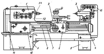 1 – передняя бабка, 2 – суппорт, 3 – задняя бабка, 4 – станина, 5 и 9 – тумбы, 6 – фартук, 7 – ходовой винт, 8 - ходовой валик, 10 – коробка подач, 11 – гитары сменных шестерен, 12 – электро-пусковая аппаратура, 13 – коробка скоростей, 14 – шпиндель.