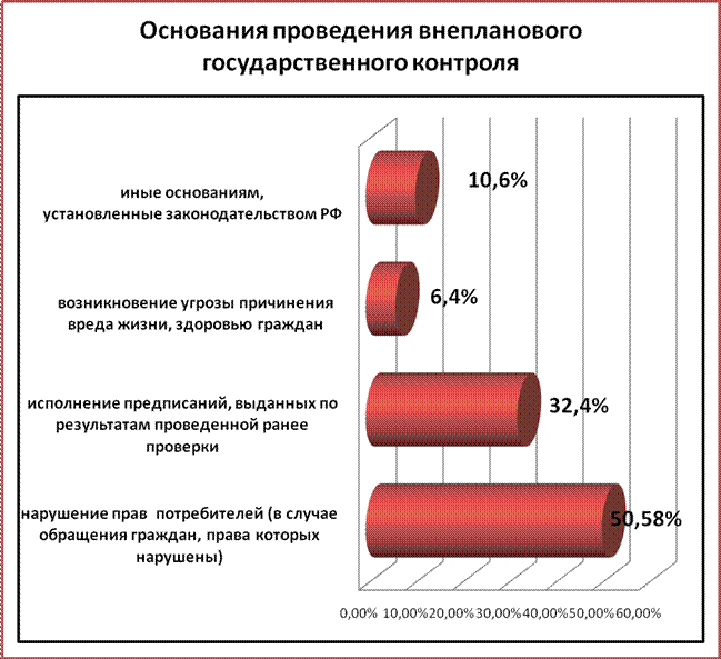 Систематизация и анализ оснований проведения внеплановых проверок показывает, что наибольшее количество проверок проведено в случаях нарушения прав потребителей (в случае обращения граждан, права которых нарушены) – 786, в рамках проверок исполнения предписаний, выданных по результатам проведенных ранее проверок – 504, при возникновении угрозы причинения вреда жизни, здоровью граждан – 99, по иным основаниям, установленным законодательством РФ – 165 (по поручению органов прокуратуры и участие в проверках, осуществляемых органами прокуратуры).