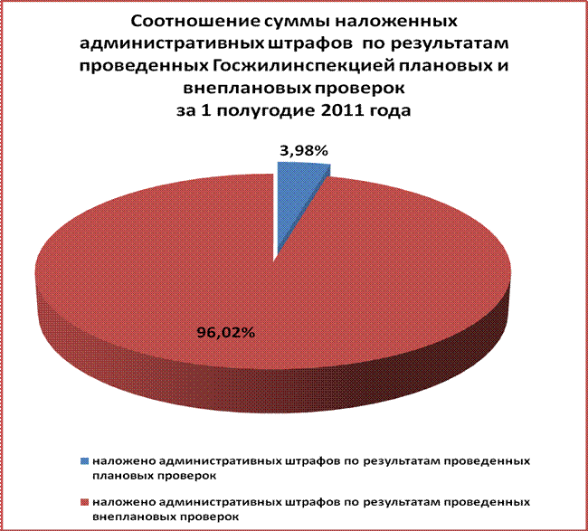 За I полугодие 2011 года по результатам рассмотрения 410 административных дел, возбужденных по фактам выявленных нарушений правил содержания и ремонта жилых домов, правил пользования жилыми помещениями и правил предоставления гражданам коммунальных услуг, Государственной жилищной инспекцией Волгоградской области в отношении виновных в совершении правонарушений лиц вынесены постановления о назначении административного наказания в виде штрафа на общую сумму 6 млн. 55 тыс. рублей. По фактам выявленных Государственной жилищной инспекцией Волгоградской области правонарушений за I полугодие 2011 года к административной ответственности привлечено 159 юридических лиц, 167 должностных лиц и 19 граждан по фактам самовольной перепланировки и переоборудования жилых помещений в многоквартирных домах.