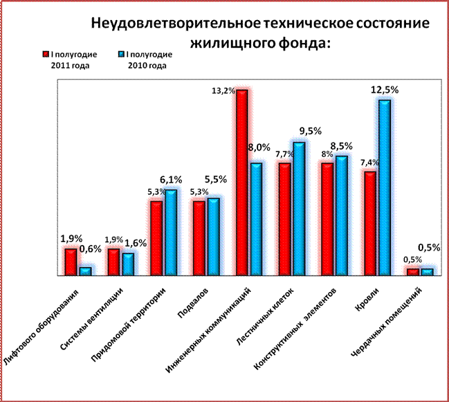 -неудовлетворительное техническое состояние внутридомовых инженерных коммуникаций и оборудования – 13,2% (системы отопления – 3,7%, системы холодного водоснабжения – 1,7%, системы горячего водоснабжения – 0,9%, системы электроснабжения – 2,5%, системы канализации – 3%, санитарно-технических приборов – 1,4%);