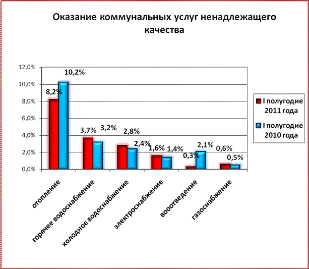 Следует отметить, что за I полугодие 2011 года уменьшилось количество обращений по вопросам оказания коммунальных услуг по отоплению, по водоотведению ненадлежащего качества.