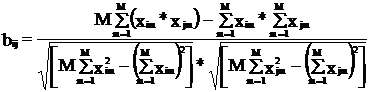 После построения матрицы вычисляются индексы парной корреляции для каждой пары (Xi Xj), а затем строится матрица B вида M х M, элементами которой являются коэффициенты парной корреляции элемент bij.