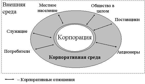 Акционеры вступают с корпорацией в особые отношения: они делают возможным само существование корпорации как поставщики "рискового" капитала, необходимого для ее возникновения, функционирования и роста. Интересы акционеров должны учитываться во всех важнейших действиях общества. То есть, корпоративная среда представляет собой область взаимодействия корпорации как объекта с теми, на кого она может в силу своих возможностей оказывать влияние (рис. 1.1).