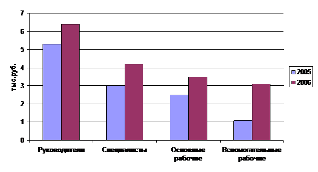 Среднемесячная заработная плата в целом по предприятию в 2006 г. составила 3.8 тыс. руб., что выше прошлогоднего уровня на 1.3 тыс. руб., или на 52.0%. Самая высокая заработная плата характерна для руководителей – 6.4 тыс. руб., при этом для заработной платы данной категории работников характерны низкие темпы прироста – 20.8 %. Средняя заработная плата специалистов в 2005 г. возросла по сравнению с прошлым годом на 40.0 % и составила 4.2 тыс. руб. Среднемесячная оплата труда основных рабочих в 2005 г. составила 3.5 тыс. руб., при этом темп ее прироста составил 40 %. Самая низкая заработная плата характерна для вспомогательных рабочих - 9.1 тыс. руб., однако темп ее роста высок по сравнению с остальными категориями персонала –281.8 %.
