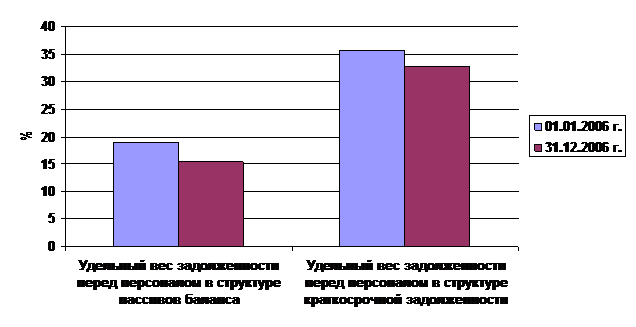 Как видно из таблицы 2.2 и рис. 2.1, задолженность по оплате труда по состоянию на 31 декабря 2006 года составила 260 тыс. руб., что больше аналогичного показателя на начало 2006 года на 3 тыс. руб., или на 1.7 %. Удельный вес задолженности перед персоналом в структуре кредиторской задолженности в течение 2005 года снизился с 35.7 % до 32.7 % (на 3.0 %). Сократился также удельный вес задолженности перед персоналом в структуре пассивов с 19.0 % до 15.3 % (на 3.7 %).