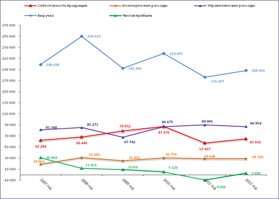 С 2008 по 2011 год наблюдалось значительное снижение чистой прибыли, в 2011 году результат от всех видов деятельности компании был убыточным, к концу анализируемого периода удалось достичь положительных результатов – чистая прибыль по итогам финансово – хозяйственной деятельности в 2012 году составила 3086 тысяч рублей.