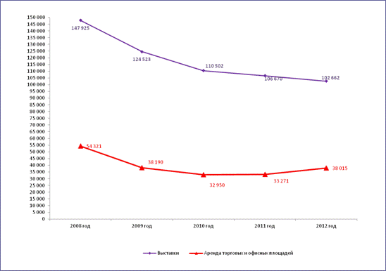 Как видно из приведенных выше диаграмм и таблицы 32, на протяжении последних четырех лет объем выручки от выставочной деятельности неуклонно снижался.