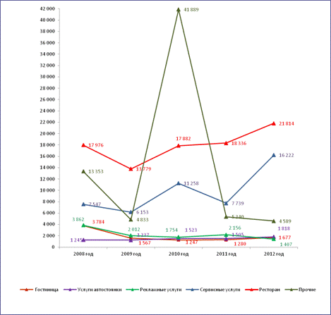 Динамика выручки Всероссийского ярмарка» за 2008 – 2012 годы по видам деятельности представлена выше, на рисунках 18 – 19, а также в таблице 32.