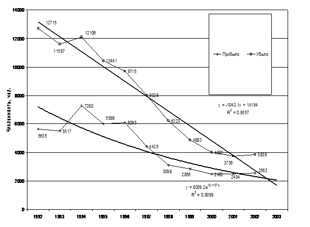 При проведении анализа миграции населения в Мурманской области была выявлена следующая особенность. Прежде всего, заслуживает внимания миграция людей возрастной группы 30–39 лет, поскольку именно в этом возрасте многие уже имеют специальность и трудовой стаж, что позволяет им искать высокооплачиваемую и привлекательную работу. На рис. 2 приведена диаграмма миграции населения этой возрастной группы в 1992–2003 гг.