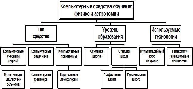 Компьютерные средства обучения физике и астрономии можно разделить и по типам средств, по уровню образования, по используемым технологиям.