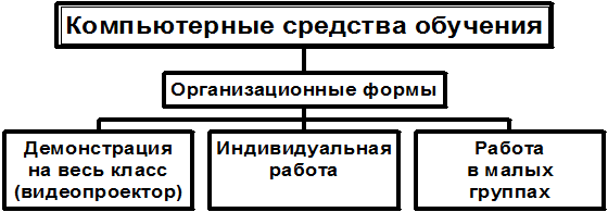 По организационным формам преобладают индивидуальная работа учащихся или работа в малых группах. При этом используются готовые программы (обучающие и демонстрационные), компьютерные проектные среды, например «Живая физика», готовые компьютерные лабораторные комплексы для проведения экспериментов, электронные задачники, интерактивные анимационные компьютерные модели физических процессов.