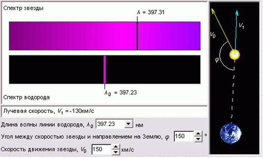Примером интерактивного эксперимента в астрономии может являться модель «Эффект Доплера» (рис.3). В модели при приближении источника излучения к наблюдателю спектр источника смещается в синюю область (т. е. длины волн всех линий уменьшаются). Наоборот, если излучающий объект удаляется от наблюдателя, то длины волн увеличиваются (т. н. красное смещение). Изменить длину спектральной линии можно, выбрав ее из списка «Длина волны», при этом будет меняться цвет.