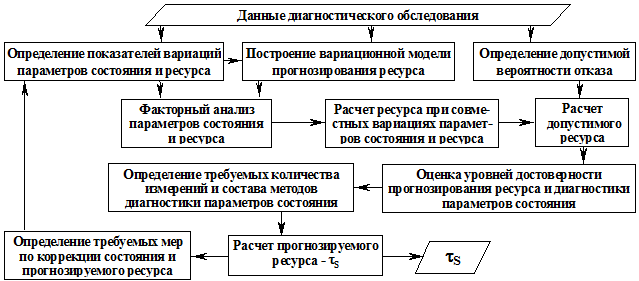 Исследованиями установлено, что источниками снижения достоверности прогнозирования ресурса являются: вариации значений параметров состояния и ресурса; недостаточные объем и достоверность документируемой информации; недостаточный состав (набор) применяемых методов диагностики, оценок несущей способности и ресурса; ограниченный или недостаточный объем выборочного контроля. Основываясь на результатах выполненных исследований разработан алгоритм (рис. 3) прогнозирования ресурса, в пределах которого обеспечиваются допустимые вероятность и риск отказа.
