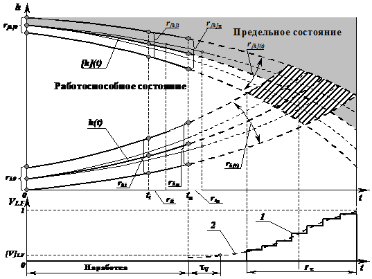 Рисунок 4 – В - модель прогнозирования ресурса: 1 и 2 – эмпирическая и теоретическая функции вероятностей отказа - V LF(t); r - размах вариаций параметров состояния и ресурса и t