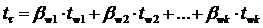 После определения варьируемых переменных выполняется повторный факторный анализ, и строятся вторичные регрессионные зависимости в натуральном масштабе вида (7) и в стандартизованном масштабе вида (8), которые учитывают изменение значений ресурса - t от изменения варьируемых переменных (параметров состояния и ресурса) - wk: