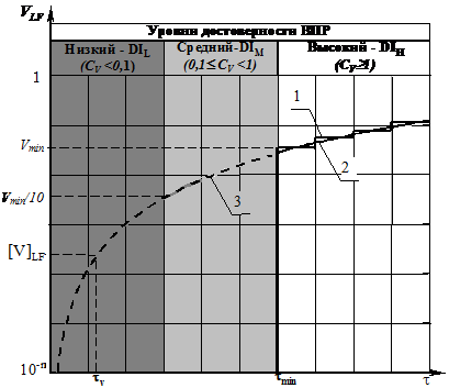 , и промежутка, на который разрабатывается прогноз, т. е. от Vmin до [V]LF, то достоверность прогноза tv можно оценить критерием достоверности прогнозирования ресурса - СV, определяемым отношением СV= [V]LF/Vmin. Экспериментально установлено, что для прогнозирования tv промежуток VLF, на который разрабатывается прогноз, не должен быть больше чем на один порядок промежутка, на котором выполняется наблюдение. В зависимости от значений СV были обоснованы градации уровней достоверности прогнозирования ресурса: DIH – высокий, DIM - средний, DIL - низкий. Метод оценки достоверности основывается на вычислении СV и оценке уровня – DI с использованием модели оценки уровней достоверности прогнозирования ресурса (рис. 5).
