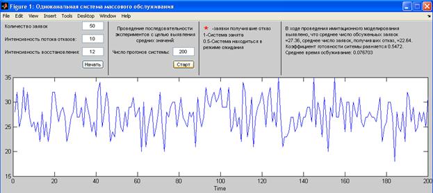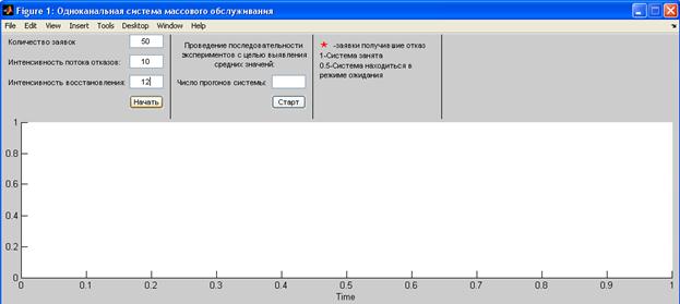 Для запуска программы необходимо в командном окне системы MATLAB ввести имя М-файла : smo. В результате должно появиться окно, представленное на рисунке 1. Для запуска имитационной модели необходимо заполнить 3 левых поля и нажать на кнопку начать, как это показано на рисунке 2.