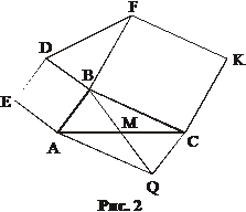 Решение. Продолжим медиану ВМ на отрезок MQ равный ВМ (рис. 2). Рассмотрим треугольники DBF и BCQ.