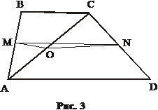 Решение. Пусть М – середина АВ, N – середина CD четырехугольника ABCD (рис. 3). Проведем диагональ АС и обозначим точкой О середину АС.