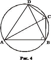 6) При определенных условиях окружность можно описать и около четырехугольника. Если четырехугольник ABCD вписан в окружность, то сумма его противоположных углов равна 1800, а углы ABD и ACD, опирающиеся на одну и туже дугу, равны (рис. 4). Верно и обратное предложение.