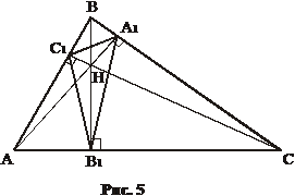 Пример 5. В остроугольном треугольнике АВС проведены высоты АА1, ВВ1, СС1. Пусть Н – точка пересечения высот. Постройте треугольник А1В1С1 и перечислите все образовавшиеся четырехугольники, около которых можно описать окружность (рис. 5).