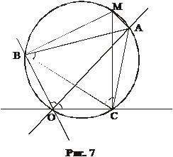 Решение. Пусть три данные прямые пересекаются в точке О; М – произвольная точка плоскости; А, В, и С основания перпендикуляров, опущенных из точки М на данные прямые (рис. 7). Точки О, М, А, В и С лежат на одной окружности с диаметром ОМ (обоснуйте это). Теперь видно, что