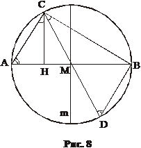 Решение. Пусть высота СН и медиана СМ треугольника АВС образует со сторонами АС и ВС равные углы (рис. 8). Опишем около треугольника АВС окружность. Достаточно доказать, что АВ – ее диаметр. Продолжим медиану СМ до пересечения с окружностью в точке D и рассмотрим треугольники АСН и DCB. Так как