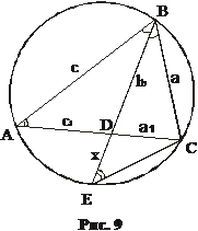 Доказательство. Около треугольника АВС опишем окружность и продолжим биссектрису BD угла В до пересечения с окружностью в точке Е (рис. 9). Соединим точки Е и С. Положим