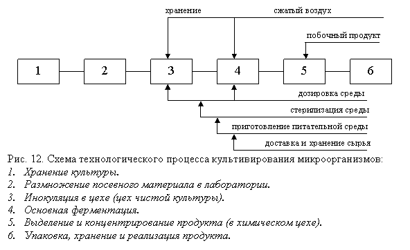 Не смотря на то, что для получения продуктов микробиологического синтеза применяются различные культуры микроорганизмов и используются разные питательные среды и режимы культивирования, процессы синтеза имеют общую структуру. О чем свидетельствует приведенная схема (рис. 12).