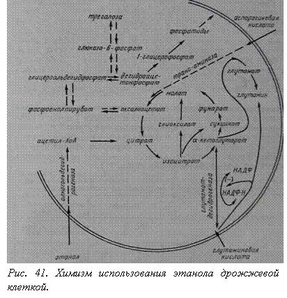 Выращивание дрожжей на этанольной среде. Ряд культур дрожжей, в том числе Saccharomyces, в условиях недостаточного обеспечения среды кислородом и при наличии углеводов получают энергию путем анаэробного расщепления сахаров (гликолиз); при этом образуется этанол. Как только в среде появляется кислород, клетки дрожжей сразу переключаются на энергетически более выгодный аэробный метаболизм (Пастеровский эффект) и способны метаболизировать не только глюкозу, но и накопившийся в среде этанол. Усваивать этанол дрожжи могут благодаря наличию в их клетках фермента алькогольдегидрогеназы (рис. 41).