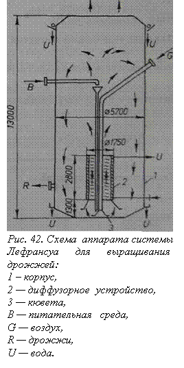 Выращивание культуры дрожжей начинается в лаборатории на 8—10%-ной солодовой питательной среде сначала в 50—100-миллилитровых колбах, затем в колбах Пастера и Карлсберга в течение 24 ч при 30°С и рН 4,5—5,5. Затем культуру размножают в инокуляторах до тех пор, пока получат посевной материал в количестве 10% от имеющегося количества сахара в рабочем объеме производственного аппарата. В инокуляторах так же, как и в лабораторной стадии, выращивание дрожжей ведется в стерильных условиях, но в них уже применяется интенсивная аэрация (30— 50 мя воздуха в час на 1 м3 среды). Основная ферментация в производстве кормовых дрожжей идет по непрерывному методу культивирования. Широко используются дрожжерастильные аппараты типа Лефрансуа, в которых среда и культура дрожжей находятся во вспененном состоянии. На рис. 42 приведен один из таких аппаратов.