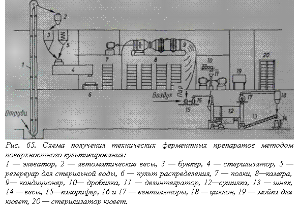 Для получения ферментных препаратов используют как микроскопические грибы, так и бактерии и дрожжи. Иногда получение технического ферментного препарата кончается проведением процесса ферментации, например в спиртовой промышленности для осахаривания крахмала используют жидкую культуру As-pergillus niger, выращенную глубинным методом культивирования на спиртовой барде с добавками крахмала (1%) и различных солей. Впоследствии ее добавляют в жидком виде в количестве 10—12% к осахариваемому затору. Однако активность ферментов в культуральной жидкости быстро снижается. Поэтому широко практикуют получение сухих технических ферментных препаратов.