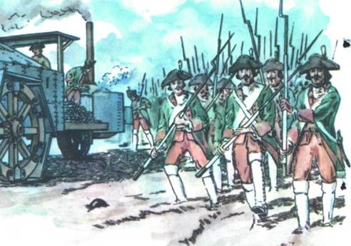Любопытно, какую боевую машину мог бы сконструировать сведущий и толковый инженер в 1770 году? Что было в его распоряжении? Сила пара, гусеничный движитель и стальные листы брони. А вооружение? Это, естественно, зависит от боевой задачи. Пусть, например, она ставится так: пробить брешь в каре пехоты (построение в виде квадрата против атак кавалерии). Ведь как в те времена пытались кавалеристы преодолевать непоколебимую стойкость пехотных каре? Кавалерийский эскадрон или полк выстраивался длинной колонной по двое и на полном скаку устремлялся на одну из сторон каре. За 10—15 шагов до нее всадники разряжали свои пистолеты в пехотинцев, описывали полукруг и возвращались обратно; при этом они и сами несли большие потери. Когда же целостность каре наконец нарушалась, кавалеристы врывались в него с саблями наголо.