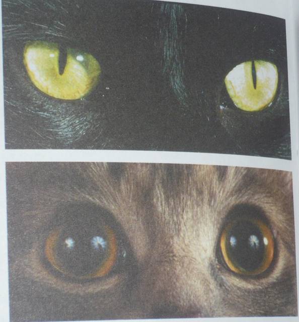 Её глаза могут приспосабливаться к источникам света различной яркости. При ярком освещении её зрачки похожи на узкие щёлочки. В темноте они становятся широкими, почти во весь глаз. Это не означае6т, что кошка может видеть в абсолютной темноте, просто ей нужно намного меньше света, чем остальным животным. Глаза кошек выпуклые, что позволяет собирать световые лучи с более широкого пространства. Когда её глаза отражают весь этот свет, они как будто светятся.