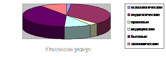 Оказано 244 тыс. услуг различного характера (в 2010 году – 260 тысяч, в 2011 году – 250 тысяч), из них оказано 13 тысяч дополнительных услуг. Самыми востребованными у обслуживаемых, как и в предыдущие периоды, являются социально-бытовые услуги.