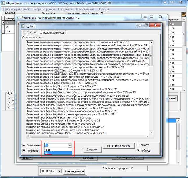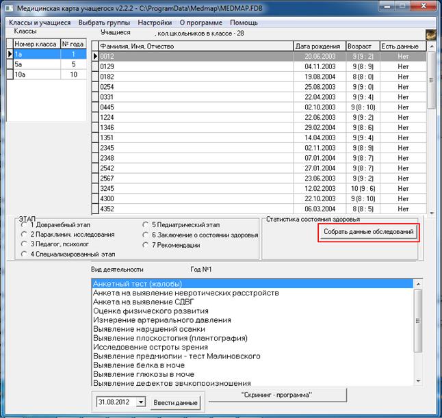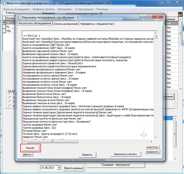 Выбрать на экране номер класса, кодовый номер ребенка, «Педиатрический этап», «Педиатр» и «Ввести данные».