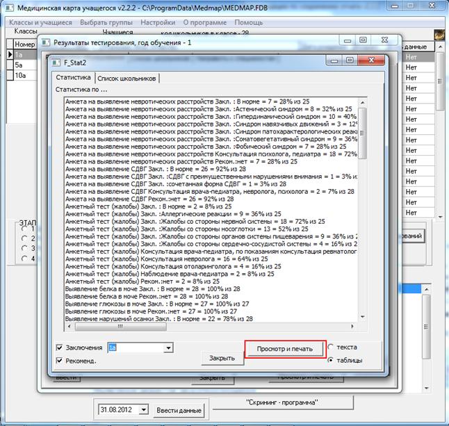 Рекомендации выдаются дифференцировано для родителей, для врача по дальнейшему медицинскому наблюдению, оздоровлению и реабилитации ребенка, выводится лист здоровья класса и лист физической подготовленности.
