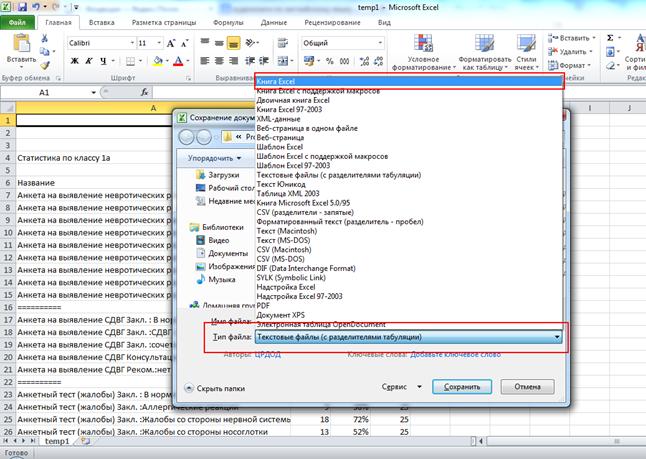 Далее выбираем Тип файла, в котором будет сохранен отчет, нужно выбрать Книга Excel.