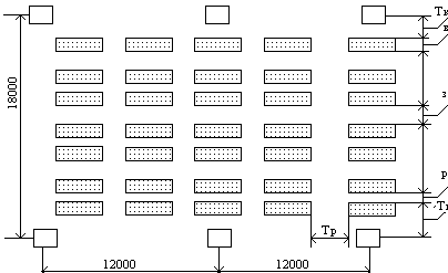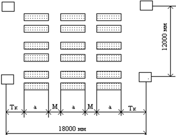 Расстановку ткацких станков чаще начинают с расчета количества станков в сетке колонн, расчет ведется с угловой ячейки. Например, размещение станков в пролете между колоннами. Станки стоят к колонне торцами (фронтальной стороной к приготовительному отделу) см. рис.2