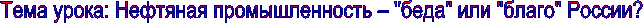 Главным вопросом сегодняшнего урока будет следующий: - « Нефтяная промышленность - беда или благо России?» Нефтяная промышленность является составной частью ТЭК - многоотраслевой системы, включающей добычу и производство топлива, производство энергии (электрической и тепловой), распределение и транспорт энергии и топлива.