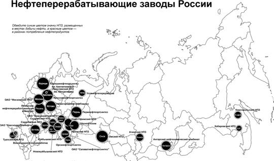 Переработка нефти происходит на НПЗ. Анализ карты: «Нефтеперерабатывающие заводы России». На данный момент в России действуют 28 заводов по переработке нефти. Производственный процесс на НПЗ осуществляется круглосуточно. Нефтеперерабатывающий завод - завод, на котором нефть разгоняют на фракции и вырабатывают из них товарные нефтепродукты и сырье для дальнейшей переработки или органического синтеза. Вдоль трасс трубопроводов и в их конечных пунктах размещаются нефтеперерабатывающие заводы (НПЗ). Мощности 26 заводов России позволяют ежегодно перерабатывать 300 млн. тонн нефти.