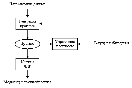 И, наконец, два важных фактора проблемы прогнозирования – возможности и интерес людей, которые делают и используют прогноз. В идеале, историческая информация анализируется автоматически, и прогноз представляется ЛПР для возможной модификации. Введение эксперта в процесс прогнозирования является очень важным, но требует сотрудничества опытных менеджеров. Далее прогноз передается ЛПР, которые используют его при принятии решений и могут получить реальную пользу от его использования.