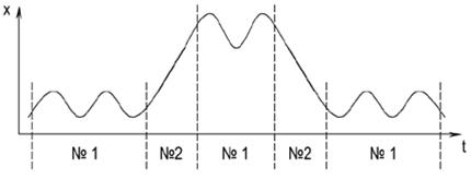 Здесь предиктор №1 имеет вид a1 ∙ sin(a2t + a3) + a4, где a1, K, a4 – настроечные коэффициенты, которые для каждого отдельного участка временного ряда рассчитываются отдельно. Предиктор №2 имеет вид a1t + a2, где a1, a2 – коэффициенты, настраиваемые по аналогичной схеме. Символами «№1» и «№2» обозначены участки временного ряда, на которых предиктор с соответствующим номером имеет лучшие прогнозирующие свойства.