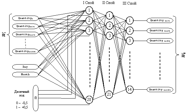 Для прогнозирования применялась трехслойная нейронная сеть по 28:21:14 нейронов в соответствующем слое, которая на основе четырнадцати предыдущих значений временного ряда предсказывала его следующее значение. В качестве нелинейного преобразователя использовалась сигмовидная функция с характеристическим коэффициентом [21]. Обучение НС осуществлялось по алгоритму обратного распространения ошибки методом скользящего окна из 14 примеров.