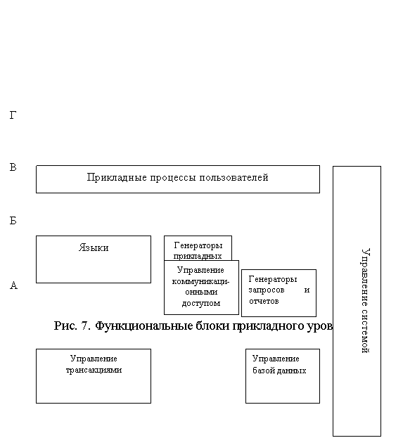 Прикладные процессы характеризуются (рис.7) большим набором функциональных блоков. Последние обеспечивают совместную работу прикладных процессов, выполняемых в различных абонентских системах.