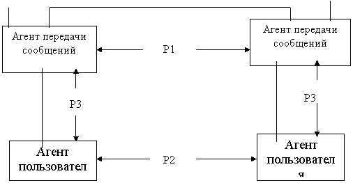 Структура сетевой службы МН8/МОТ18 содержит (рис.10) два основных компонента. Они называются агентами передачи сообщений и агентами пользователей. Агент передачи сообщений, именуемый также электронным почтовым отделением, выполняет функции, связанные с хранением и обработкой сообщений. К ним относятся адресация, регистрация, копирование, уничтожение, пересылка сообщений. Агенты передачи сообщений в соответствии с протоколом Р1 взаимодействуют друг с другом, обеспечивая передачу и промежуточное хранение сообщений. Протокол Р2 определяет передачу сообщений непосредственно между пользователями. К агенту передачи сообщений на основе протокола РЗ подключаются агенты пользователей. Агент передачи сообщений может также являться лишь промежуточным (пересылочным) почтовым отделением. Агент пользователя предоставляет местные услуги, включающие ввод, редактирование, копирование, передачу и прием сообщений.