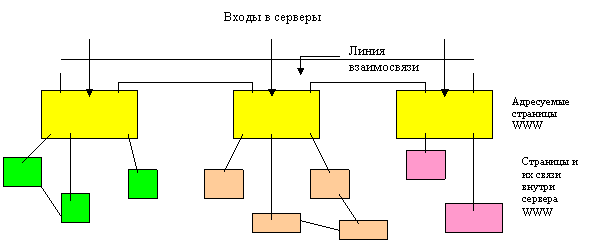 Вводной частью гипертекстовой базы, расположенной в сервере, является (рис.13) адресуемая страница. Она имеет уникальный адрес, по которому к ней можно обратиться. Адресуемая страница является визитной карточкой юридического лица, создавшего базу данных или знаний. В этой странице определяются название, (имя), реквизиты, цели и задачи. Здесь же представляется информация о направлениях деятельности лица, решаемых им технических, технологических или иных проблемах. Вслед за этим, стартовым документом (адресуемой страницей), дается группа других взаимосвязанных страниц WWW, содержащих дополнительную информацию. Все страницы оформляются таким образом, что в их текстах даются гипертекстовые ссылки на любые другие документы, содержащиеся как в том же, так и в других серверах WWW. При этом безразлично, где находится предлагаемый далее для просмотра документ, в той же комнате либо на другом континенте.