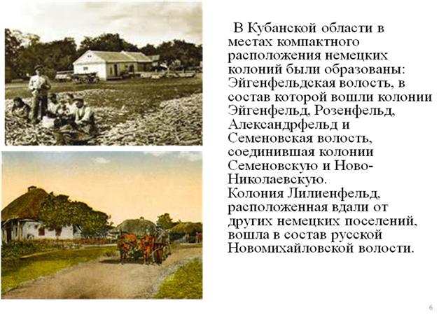 Немецкие поселения на Кубани появляются в середине XIX века. Если немцев Кубань привлекала прежде всего дешевой и плодородной землей и независимым положением колоний, то в России давно оценили такие качества немецкого характера, как основательность, трудолюбие дисциплинированность и умение рационально вести хозяйство. Колонисты занимались хлебопашеством и огородничеством: выращивали картофель, свеклу, табак, лен, почти при каждом доме были сад и виноградник.