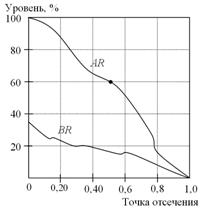 Изменяя балл отсечения тендерной карты, находится оптимальное соотношение между ошибками I и II рода. Существуют различные стратегии для выбора такого соотношения. Например, часто точка отсечения выбирается таким образом, чтобы сумма ошибок (FN+FP) была минимальна. Для этого ROC-кривую представляют в виде наложения двух кривых (рис. 6): кривой approval-rate (доля одобрений заявок подрядчика, AR) и кривой bad-rate (доля «плохих» подрядчиков, BR).